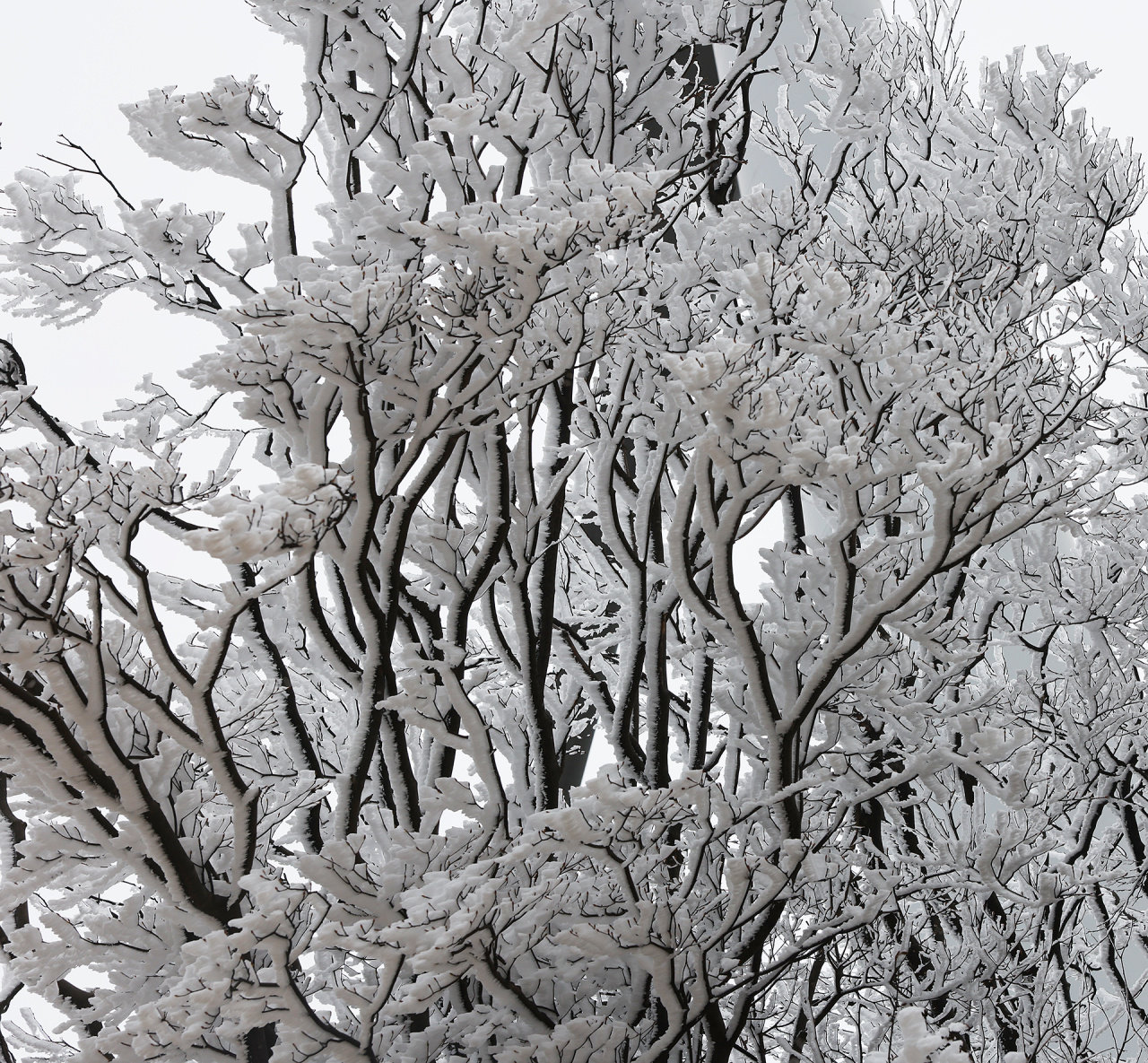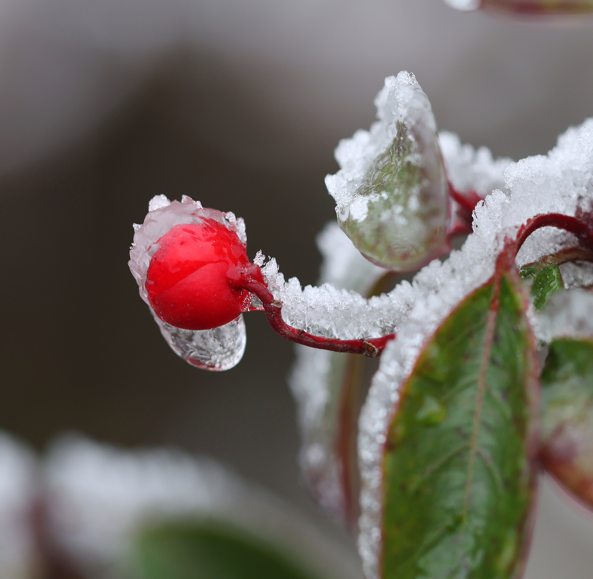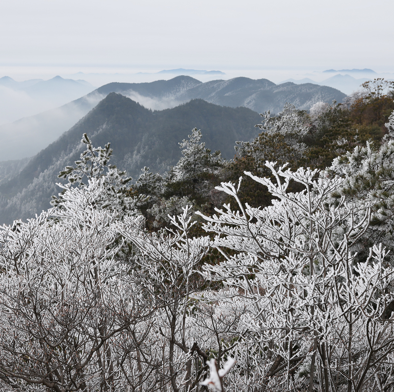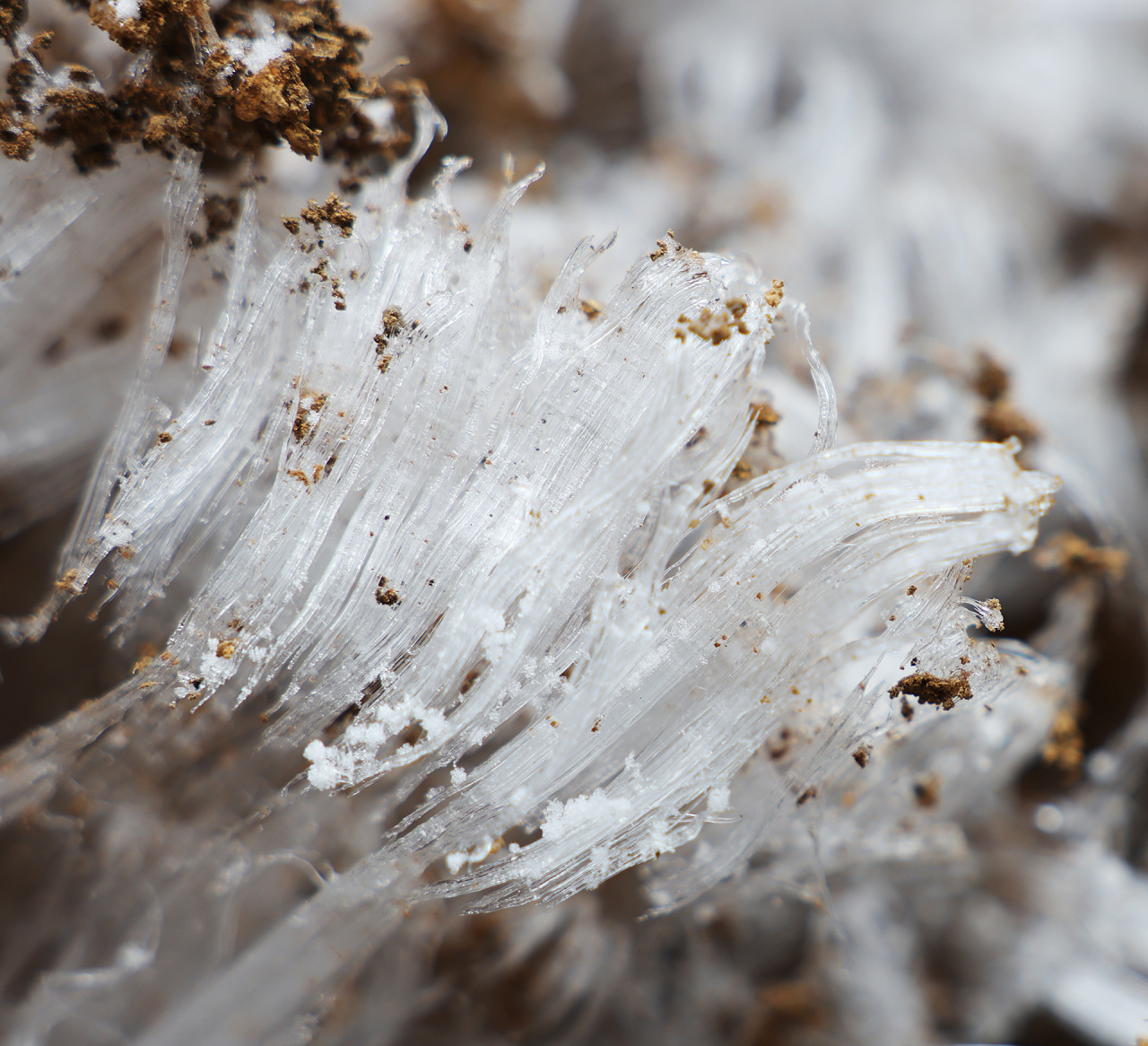 低溫濕冷的天氣,給雙苗尖悄悄披上了一層潔白的輕紗。松樹與灌木仿佛一夜之間開出了玉樹瓊花,美得令人屏息;樹枝上、野果上、葉片上、草叢間,凝結(jié)著晶瑩的霧凇;地面的土層在凍脹作用下,也鉆出了一針針細(xì)長的冰晶。在鏡頭下,這些自然雕琢的細(xì)節(jié)被放大,仿佛走進(jìn)了一個(gè)靜謐而奇幻的冰雪世界。