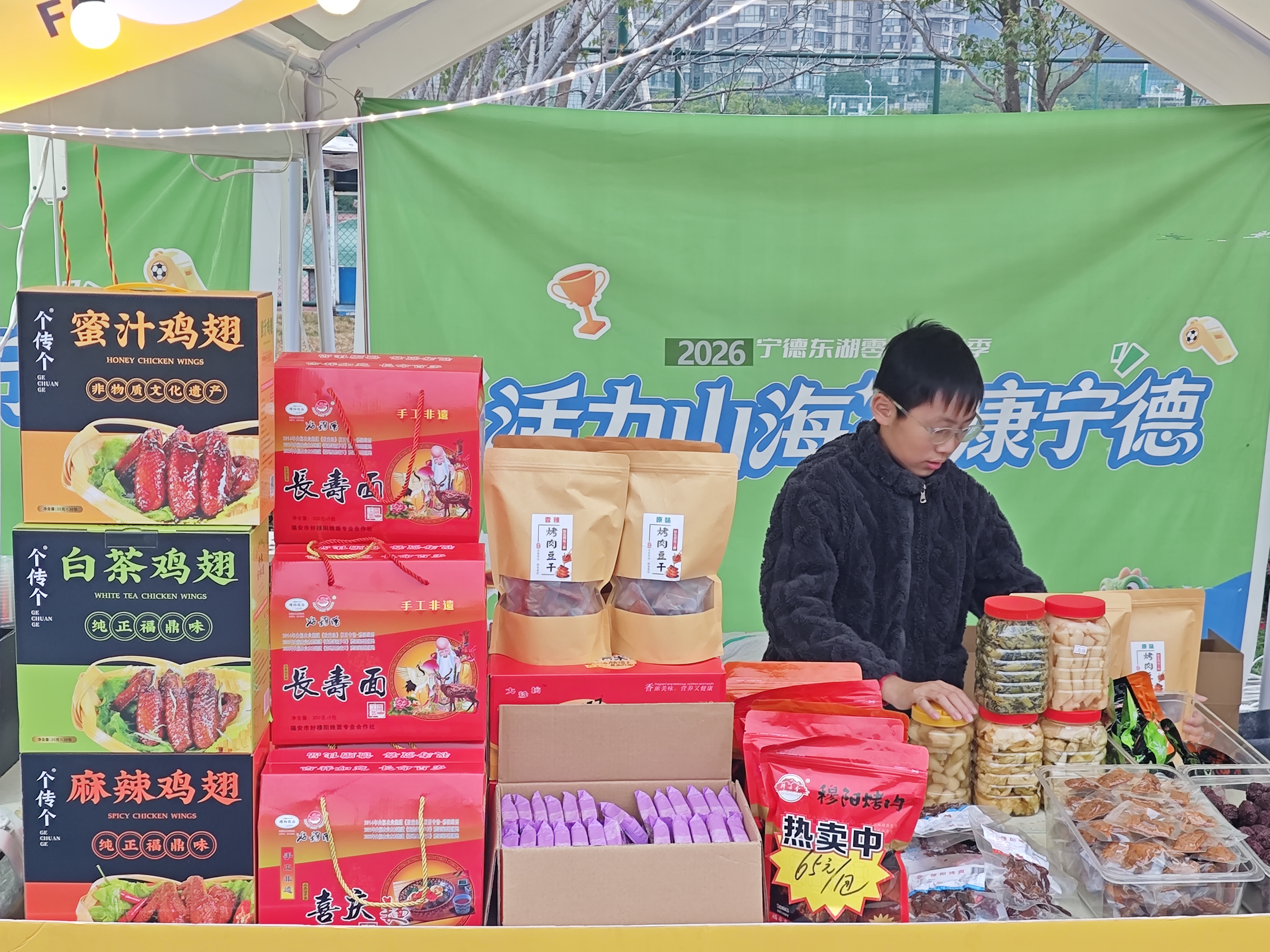 賽場之上,球員們奮勇拼搏,觀眾陣陣歡呼。賽場之外的集市內人頭攢動,攤位上商品琳瑯滿目,既有穆陽烤肉、豆干、筍干等寧德本土特色年貨,也有花生、紅棗、夏威夷果等零嘴干貨,更不乏空調、冰箱等實用生活家電,一站式滿足市民采購與味蕾需求。