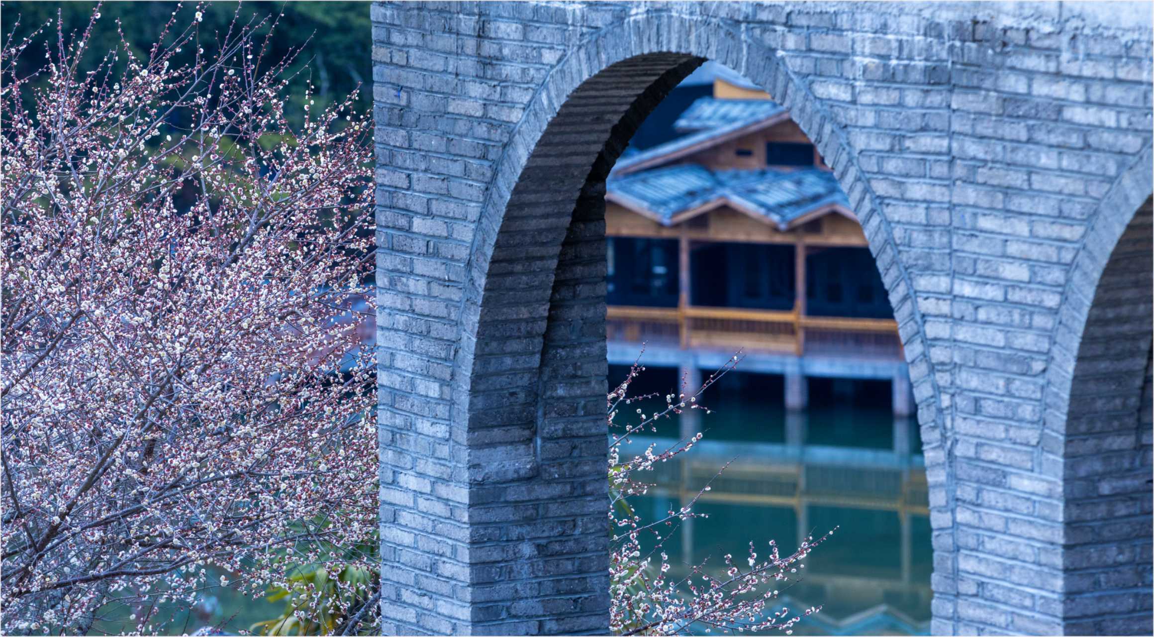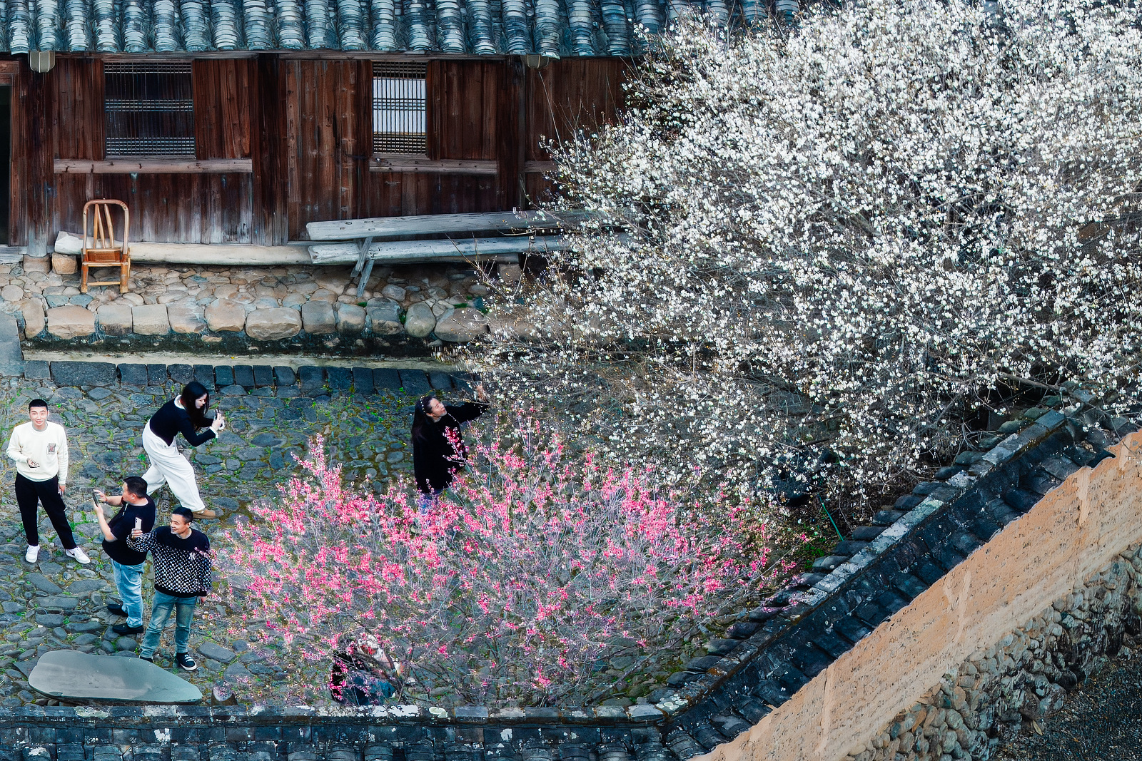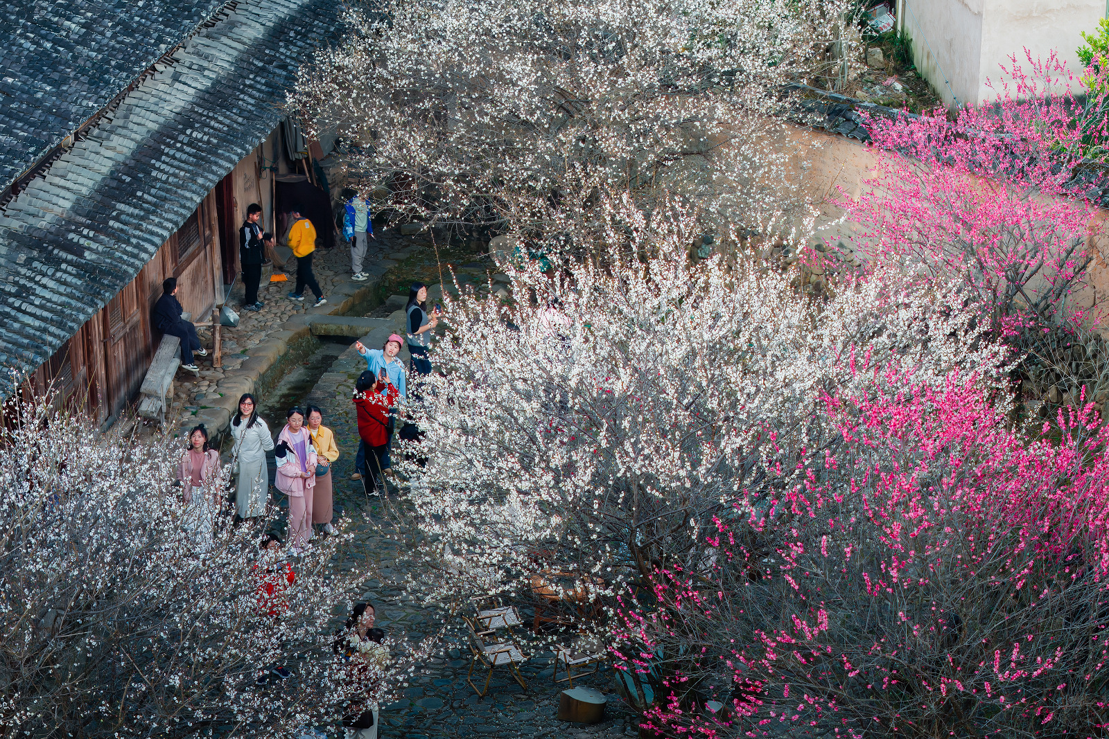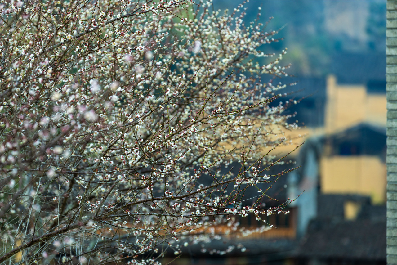 紅的熱烈似火、白的清雅如雪,兩種顏色的梅花交織盛放,配上古民居的黛瓦老房,古韻味直接拉滿。