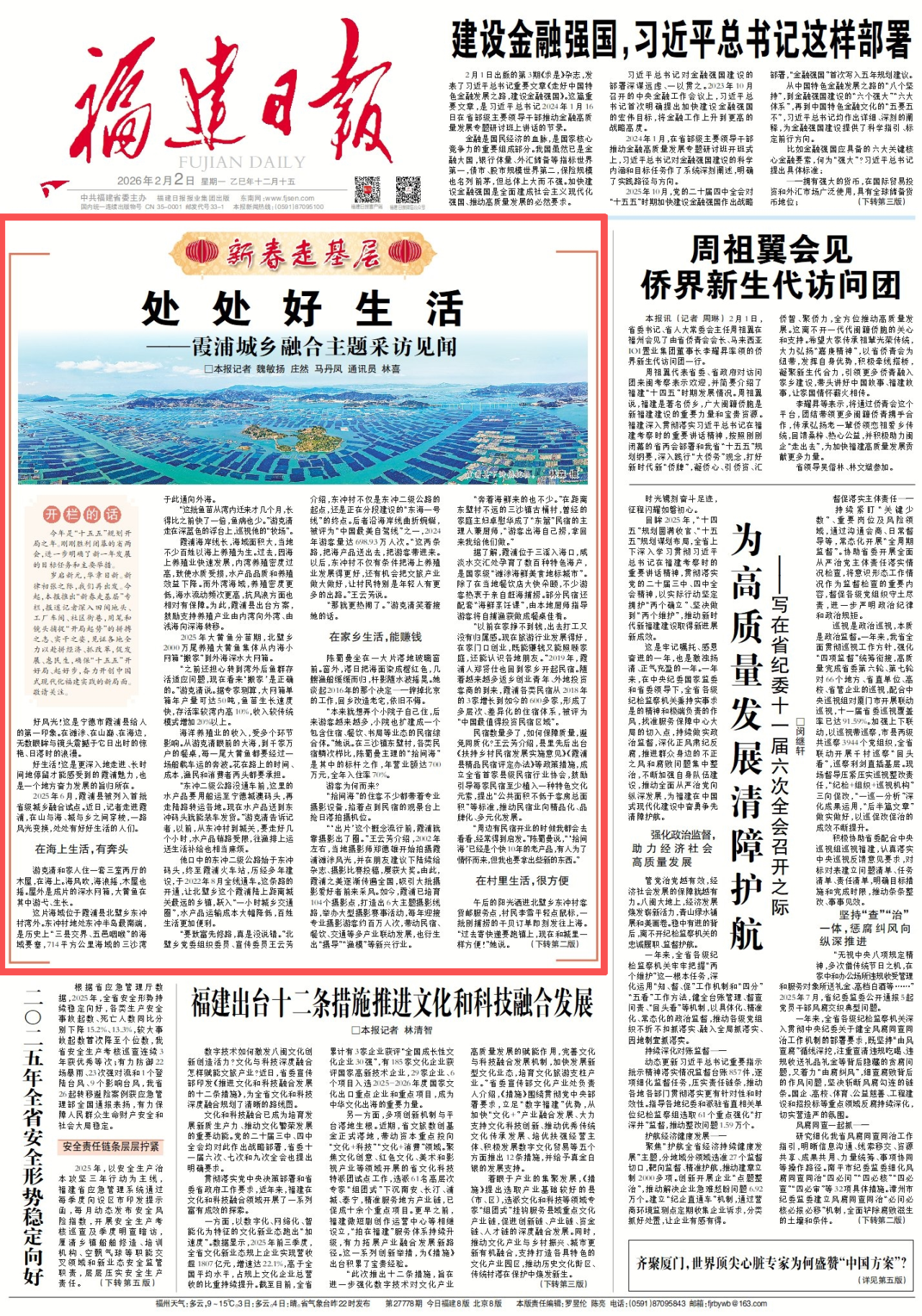 歲啟新元,華章日新。新律初張之際,我們再出發。今起,福建日報推出“新春走基層”專欄,報道記者深入田間地頭、工廠車間、社區街巷,用筆和鏡頭捕捉“開局起勢”的拼搏之志、實干之姿,見證各地全力以赴拼經濟、抓改革,促發展、惠民生,確保“十五五”開好局、起好步,奮力開創中國式現代化福建實踐的新局面。敬請關注。