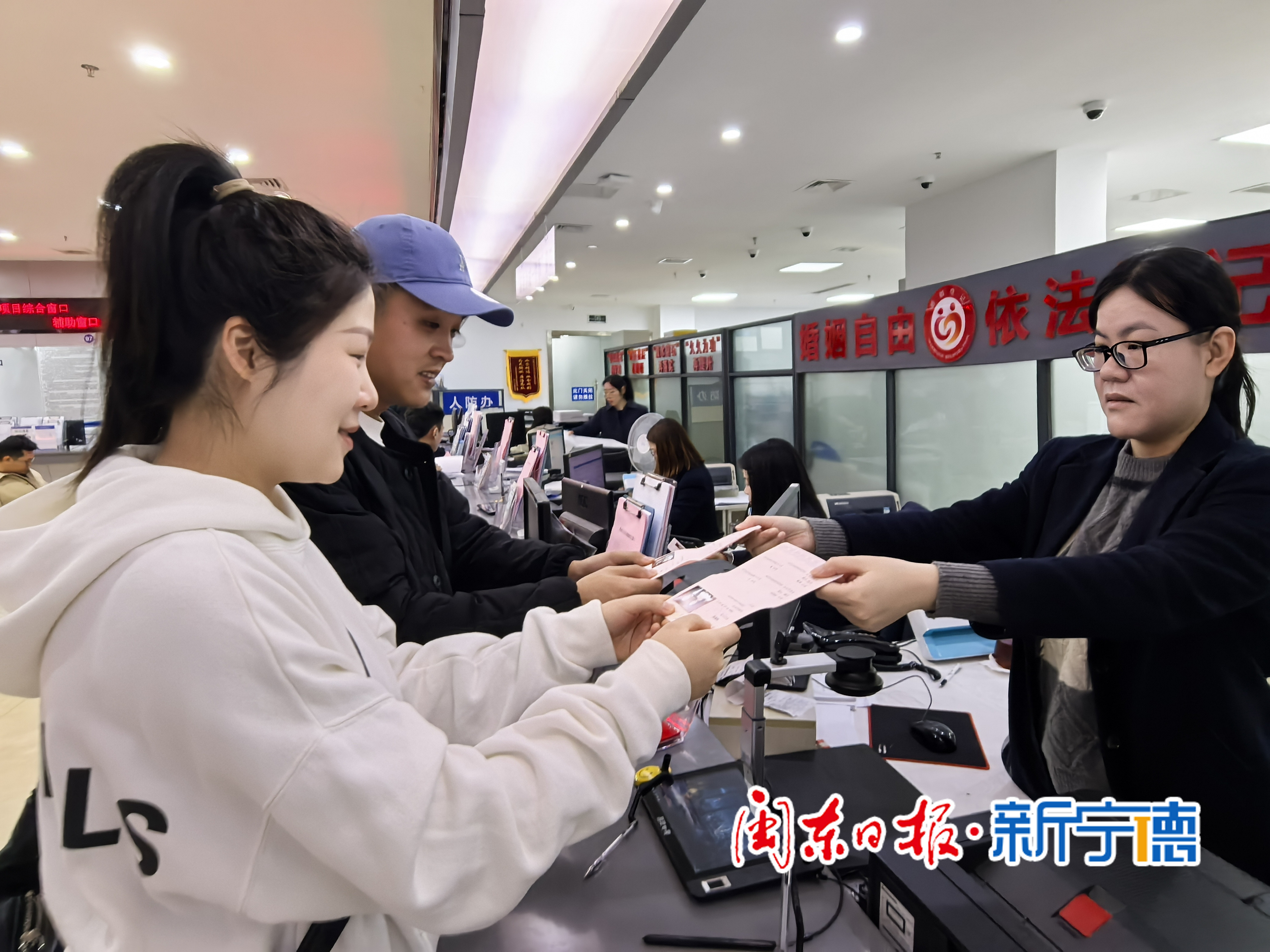 截至當天12時,蕉城區政務服務中心婚登窗口共接待新人70對,預計全天將有90余對新人順利領取結婚證,開啟婚姻新生活。