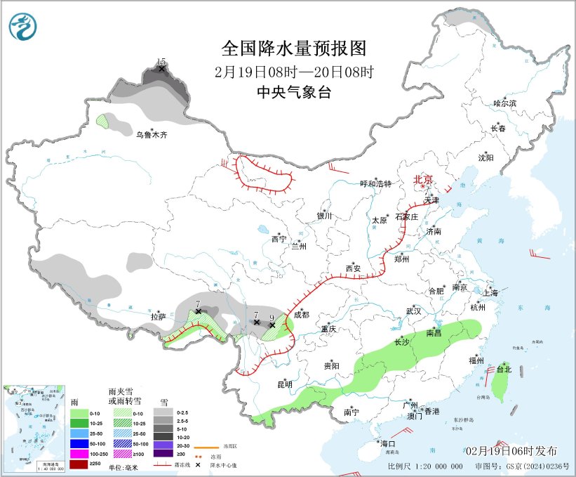2月19日08時(shí)至20日08時(shí),新疆北疆地區(qū)、西藏北部和東部、川西高原南部以及黑龍江西北部等地部分地區(qū)有小雪或雨夾雪,其中,西藏東南部、湖南中南部、江西中北部、浙江中南部、福建西北部、四川盆地西南部、貴州東南部、云南南部、廣西西部和北部、臺(tái)灣島等地部分地區(qū)有小雨。內(nèi)蒙古西北部、甘肅北部等地部分地區(qū)有4~6級(jí)風(fēng),陣風(fēng)7~8級(jí)(見圖1)。臺(tái)灣海峽、巴士海峽、南海西部和東部海域?qū)⒂?~7級(jí)風(fēng)、陣風(fēng)7~8級(jí)。