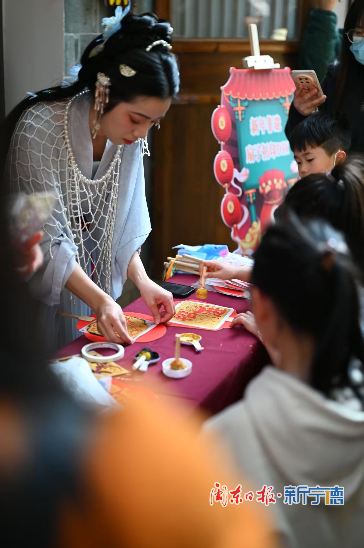 活動期間,身著各式漢服的隊伍漫步古街,成為一道亮麗風(fēng)景,引得游客爭相合影;傳統(tǒng)手工集市人氣高漲,帶有古街元素的文創(chuàng)產(chǎn)品備受青睞,成為打卡“爆款”。互動體驗區(qū)亮點紛呈:漢服演員或化身“貨郎”叫賣糖葫蘆,還原古代市井年味,或帶領(lǐng)游客制作非遺漆扇、香珠手串、燈籠等手作工藝品,傳遞非遺之美;投壺游戲深受孩子喜愛,現(xiàn)場歡聲笑語不斷;茶道體驗席上,游客靜坐品茗,在茶香裊裊中感受雅致心境;漢服樂者撫琴彈奏,樂聲與青瓦古厝相映成趣,盡顯古街韻味。