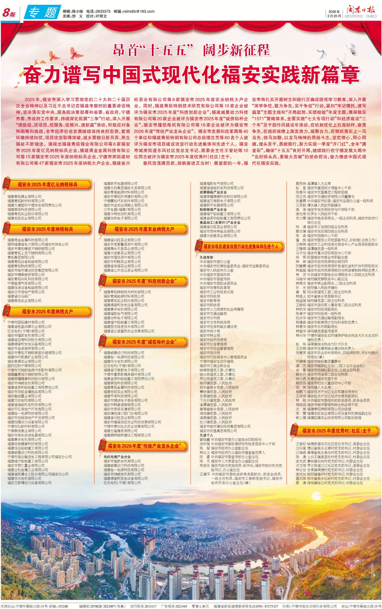 2025年,福安市深入學(xué)習(xí)貫徹黨的二十大和二十屆歷次全會(huì)精神以及習(xí)近平總書記在福建考察時(shí)的重要講話精神,堅(jiān)決落實(shí)黨中央、國(guó)務(wù)院決策部署和省委、省政府,寧德市委、市政府工作要求,持續(xù)深化拓展“三爭(zhēng)”行動(dòng),深入開展“提能級(jí)、攻項(xiàng)目、優(yōu)服務(wù)、促振興、譜新篇”活動(dòng),積極應(yīng)對(duì)各種困難和挑戰(zhàn),全市經(jīng)濟(jì)社會(huì)發(fā)展繼續(xù)保持良好態(tài)勢(shì),營(yíng)商環(huán)境持續(xù)向優(yōu),項(xiàng)目攻堅(jiān)取得突破,城鄉(xiāng)面貌日新月異,民生福祉不斷增進(jìn)。涌現(xiàn)出福建青拓鎳業(yè)有限公司等6家福安市2025年度億元納稅標(biāo)兵企業(yè),福建甬金金屬科技有限公司等15家福安市2025年度納稅標(biāo)兵企業(yè),寧德市固拓建材有限公司等47家福安市2025年度納稅大戶企業(yè),福建省興旺茶業(yè)有限公司等8家福安市2025年度農(nóng)業(yè)納稅大戶企業(yè)。同時(shí),福建青拓特鋼技術(shù)研究有限公司等10家企業(yè)被評(píng)為福安市2025年度“科技創(chuàng)新企業(yè)”,福建威曼動(dòng)力科技有限公司等20家企業(yè)被評(píng)為福安市2025年度“誠(chéng)信標(biāo)桿企業(yè)”,福安市隆凱電機(jī)有限公司等16家企業(yè)被評(píng)為福安市2026年度“傳統(tǒng)產(chǎn)業(yè)龍頭企業(yè)”。福安市發(fā)展和改革局等40個(gè)單位和福建青拓特鋼有限公司總經(jīng)理沈亮等60名個(gè)人被評(píng)為福安市項(xiàng)目建設(shè)攻堅(jiān)行動(dòng)先進(jìn)集體和先進(jìn)個(gè)人。福安市城南街道東風(fēng)社區(qū)黨總支書記、居委會(huì)主任王智妃等10位同志被評(píng)為福安市2025年度優(yōu)秀村(社區(qū))主干。