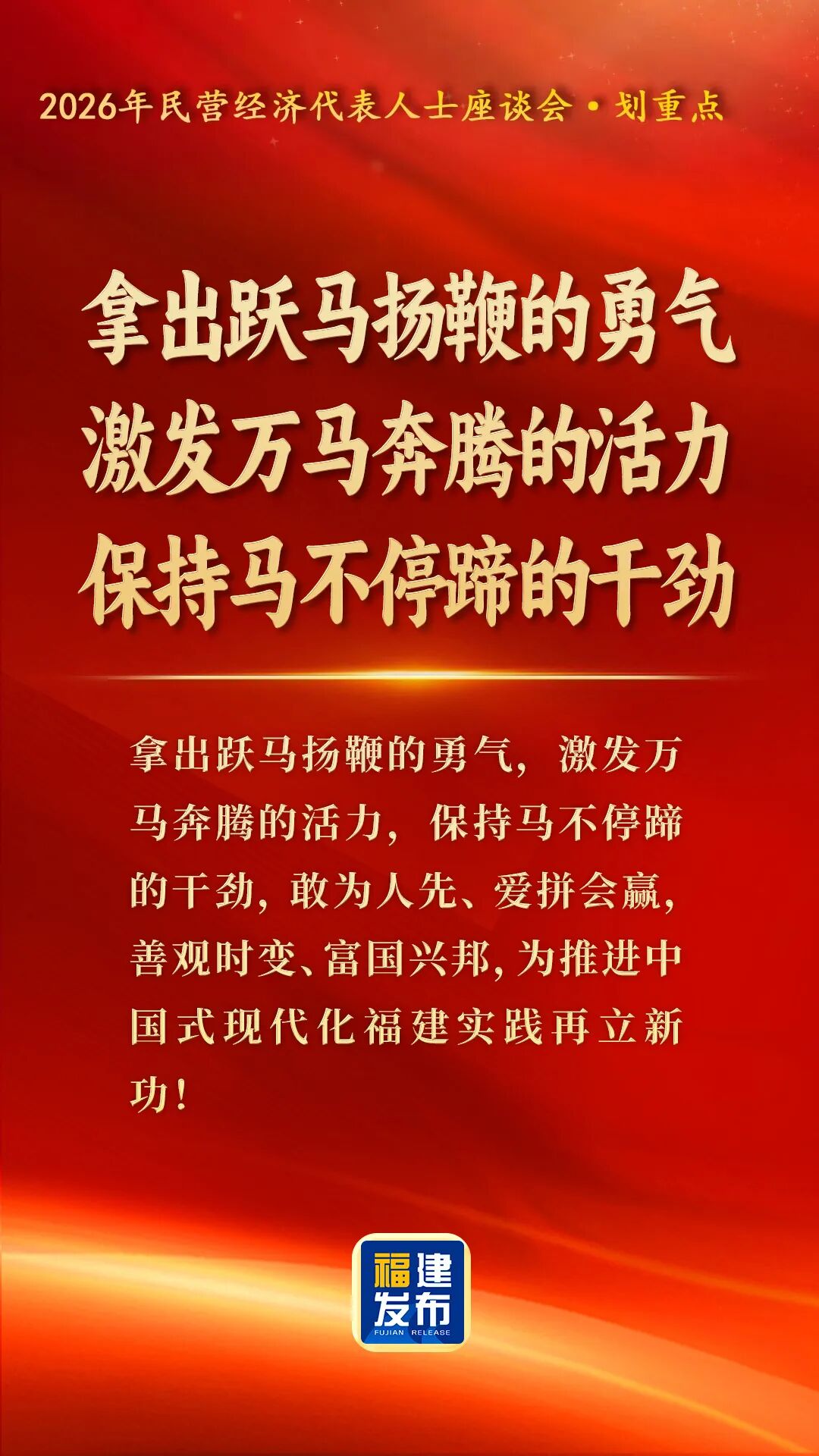 丙午馬年開假第一天,2月24日,省委、省政府連續(xù)第六年以“新春第一會”形式,在福州召開民營經(jīng)濟(jì)代表人士座談會。會上,省領(lǐng)導(dǎo)與民營企業(yè)家共同學(xué)習(xí)貫徹習(xí)近平總書記關(guān)于民營經(jīng)濟(jì)發(fā)展的重要論述,研究促進(jìn)民營經(jīng)濟(jì)健康發(fā)展、高質(zhì)量發(fā)展,激發(fā)“開局起勢”的強(qiáng)大動力,以旗幟鮮明的態(tài)度、真真切切的尊重和實實在在的舉措,鼓勵和支持全省廣大民營企業(yè)和民營企業(yè)家堅定信心、振奮精神、奮勇爭先,為實現(xiàn)“十五五”良好開局、奮力譜寫新征程新福建建設(shè)新篇章作出新的貢獻(xiàn)。省委書記、省人大常委會主任周祖翼出席并講話,省委副書記、省長趙龍主持。省政協(xié)主席滕佳材,省委副書記、福州市委書記郭寧寧出席。