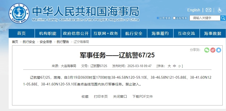 據中國海事局網站消息,大連海事局發布航行警告,3月19日6時至17時,渤海部分海域執行軍事任務,禁止駛入。