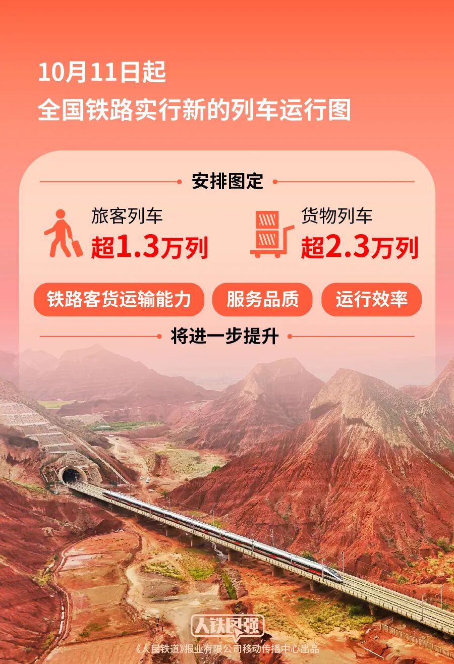10月11日起,全國鐵路實行新的列車運行圖,保持客貨列車開行規模,優化列車開行結構,安排圖定旅客列車超1.3萬列,貨物列車超2.3萬列,鐵路客貨運輸能力、服務品質和運行效率將進一步提升。