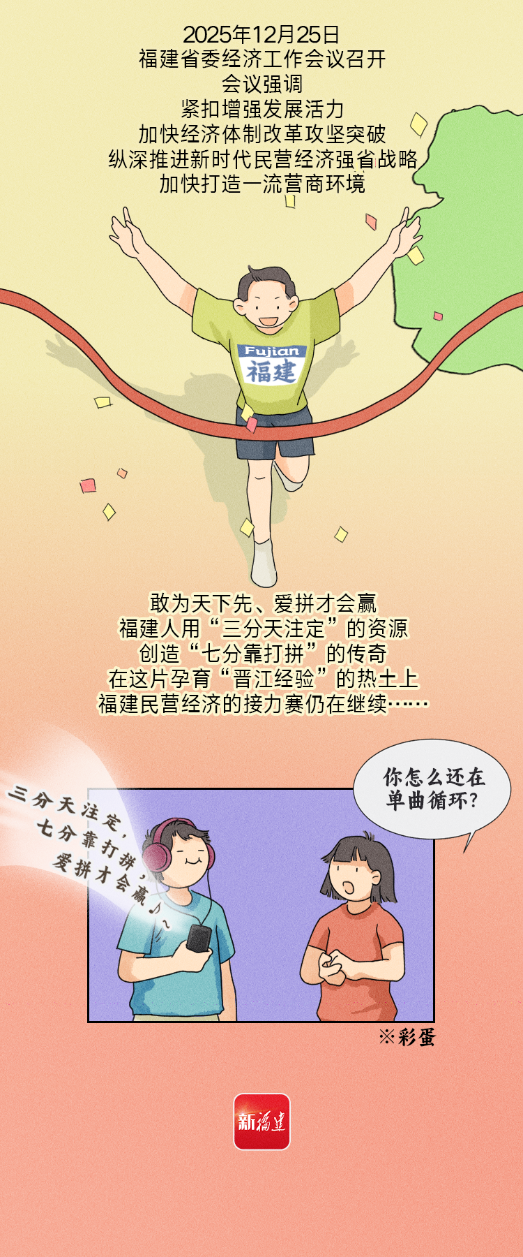 敢為人先,愛拼會贏。2025年1月初,福建首次召開全省優化營商環境大會,強調要在推進一流營商環境建設上奮勇爭先。2025年,福建出臺首部優化營商環境中長期規劃,推進“高效辦成一件事”等改革,截至11月底,全省實有經營主體771.1萬戶,八閩大地營商環境持續優化升級。